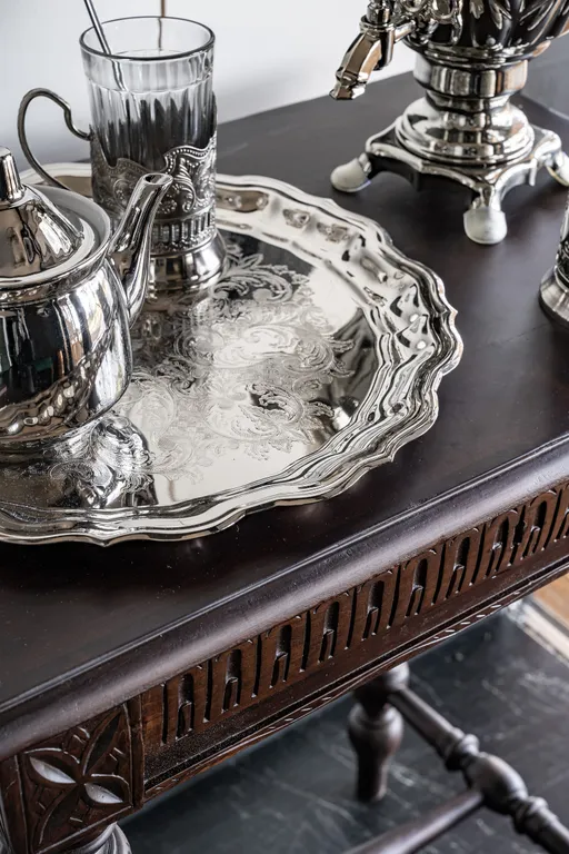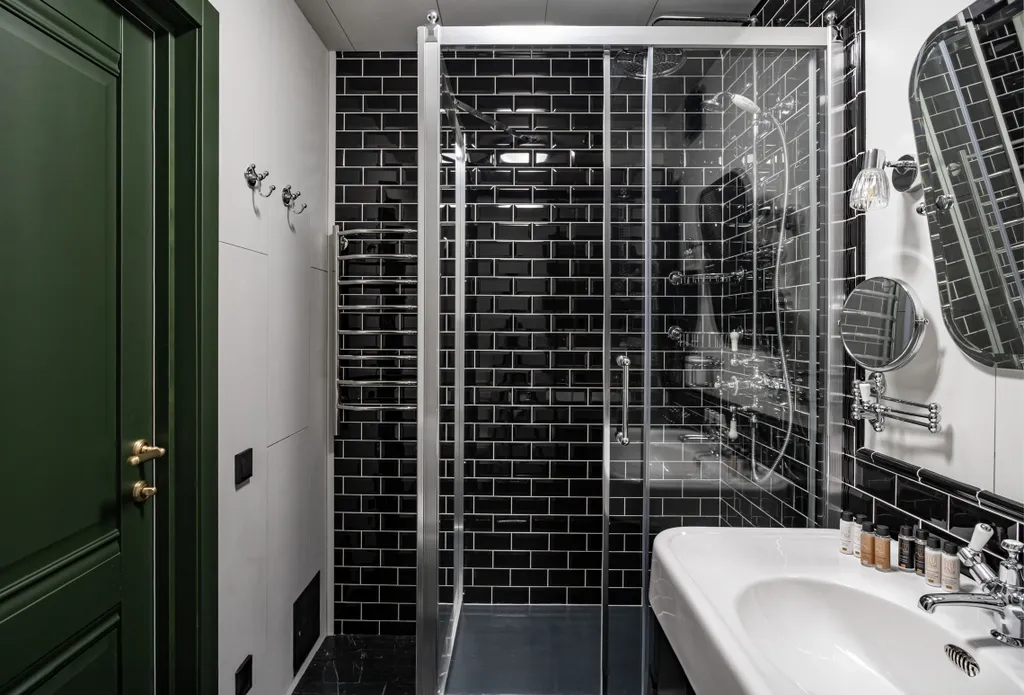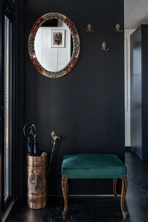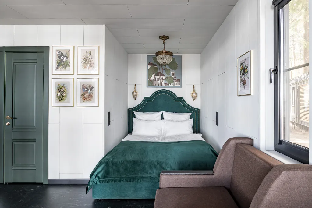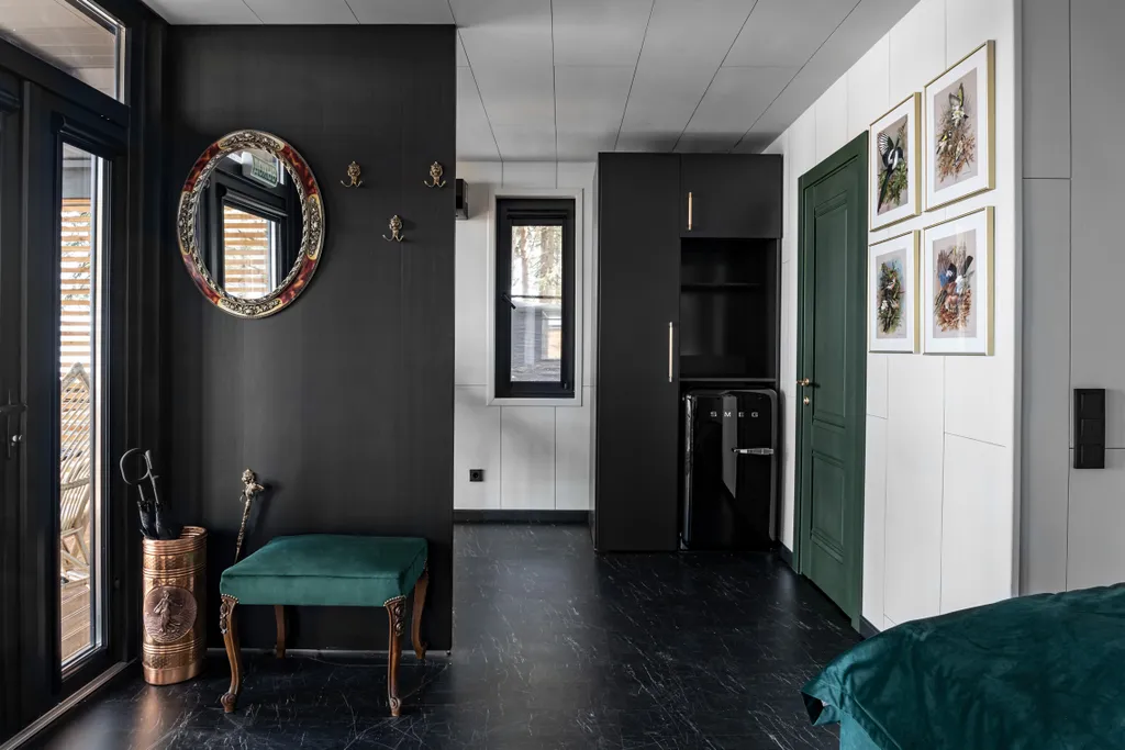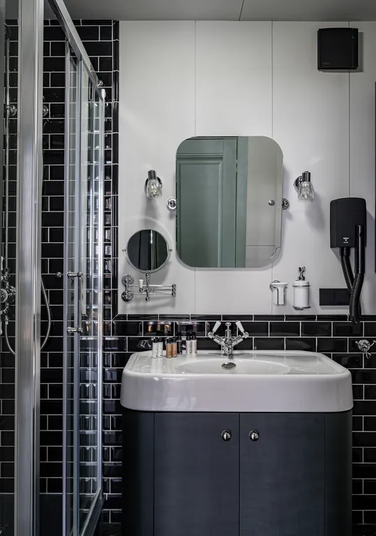 Двуспальная кровать и кресло-кровать. Консоль-барная стойка, которая может использоваться и как письменный стол, дизайнерский холодильник SMEG с обновляемым ассортиментом мини-бара, самовар с чайным набором, бокалы для вина, санузел в британском стиле начала 20 века с душем, фен, кондиционер, антикварное зеркало и уникальные интерьерные предметы.